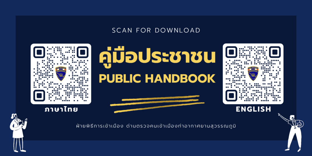 ฝ่ายพิธีการเข้าเมือง ด่านตรวจคนเข้าเมืองท่าอากาศยานสุวรรณภูมิ มิได้มีบริการ E-SERVICE แต่อย่างใด ข้อมูลในส่วนนี้จัดทำเพื่อความสะดวกของประชาชนในการติดต่อประสานงานกับหน่วยอื่น ๆ ที่เกี่ยวข้องเท่านั้น กรุณาตรวจสอบข้อมูลของท่านกับหน่วยงานที่ท่านจะไปดำเนินการต่าง ๆ อีกครั้งเพื่อความถูกต้อง