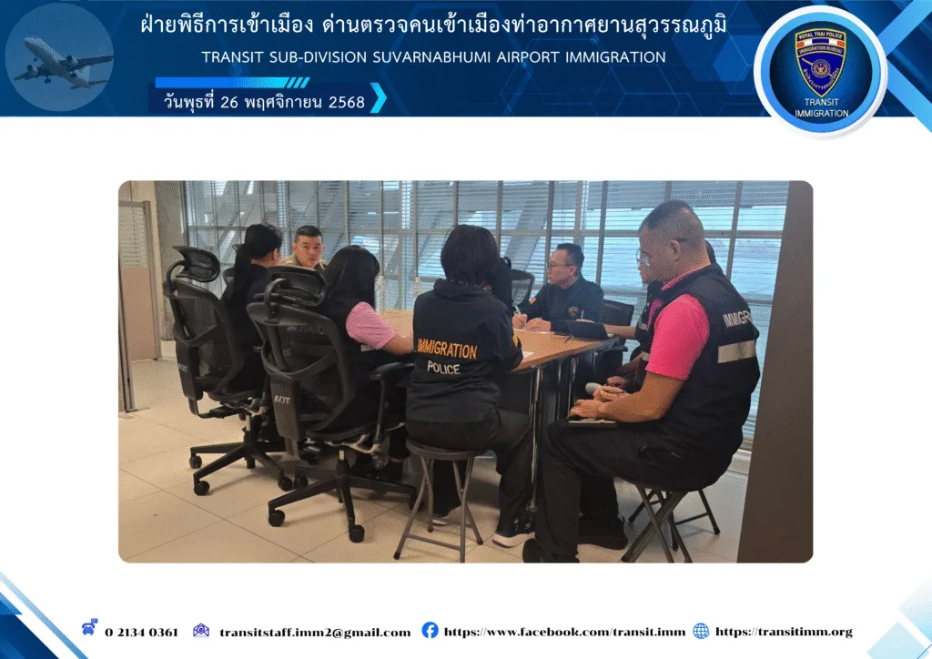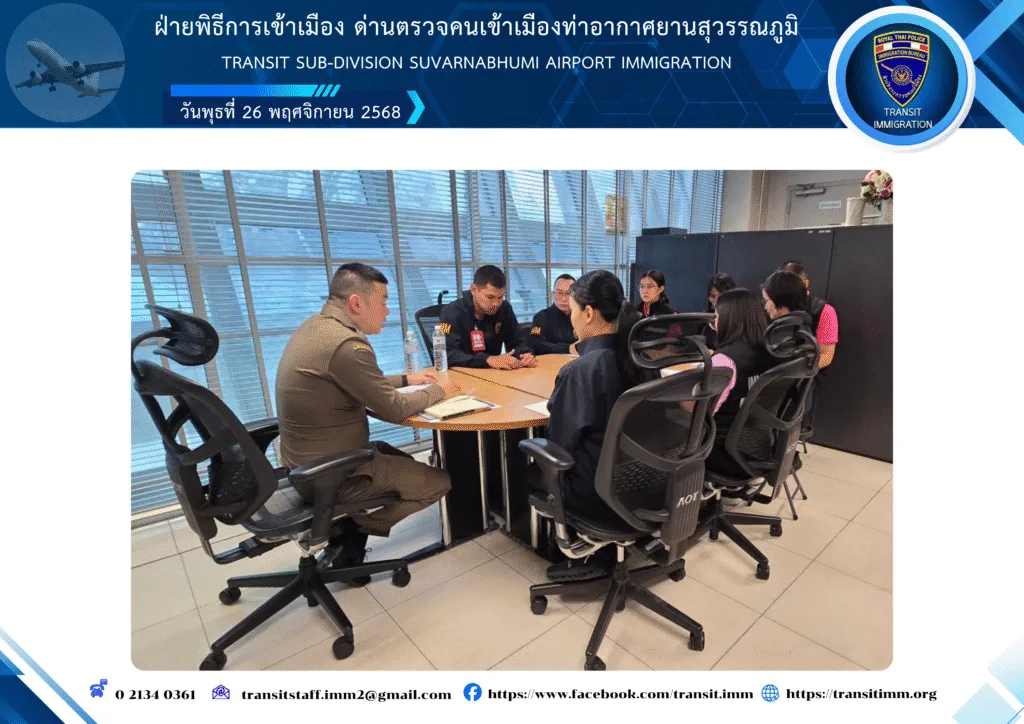 วันพุธที่ 26 พฤศจิกายน 2568 เวลา 14.00 น. พันตำรวจเอก กฤษณ์ ฉัตรทวี ผู้กำกับการฝ่ายพิธีการเข้าเมือง ด่านตรวจคนเข้าเมืองท่าอากาศยานสุวรรณภูมิ ประชุมบริหารราชการฝ่ายพิธีการเข้าเมือง ด่านตรวจคนเข้าเมืองท่าอากาศยานสุวรรณภูมิ ครั้งที่ 14/2568 ณ ห้องประชุม ฝ่ายพิธีการเข้าเมือง ฯ ท่าอากาศยานสุวรรณภูมิ และประชุมผ่านระบบ Zoom Meeting มี รองผู้กำกับการฯ และ สารวัตรฯ ในสังกัดเข้าร่วมประชุม โดยได้ชี้แจ้งข้อราชการที่สำคัญ, กำชับการปฏิบัติหน้าที่ตามนโยบายและข้อสั่งการของ ผู้บังคับบัญชาระดับ สำนักงานตำรวจแห่งชาติ, สำนักงานตรวจคนเข้าเมือง และกองบังคับการตรวจคนเข้าเมือง 2, สอบถามปัญหาข้อขัดข้องการปฏิบัติหน้าที่ เพื่อให้การปฏิบัติงานเป็นไปด้วยความเรียบร้อย มีประสิทธิภาพ, ถ่ายทอดความรู้เกี่ยวกับ พ.ร.บ.ป้องกันและปราบปรามการทรมานและกระทำให้บุคคลสูญหาย พ.ศ. 2565 และจริยธรรมจรรยาบรรณของตำรวจ พร้อมทั้งขอบคุณและให้กำลังใจข้าราชการตำรวจทุกนายในการปฏิบัติหน้าที่