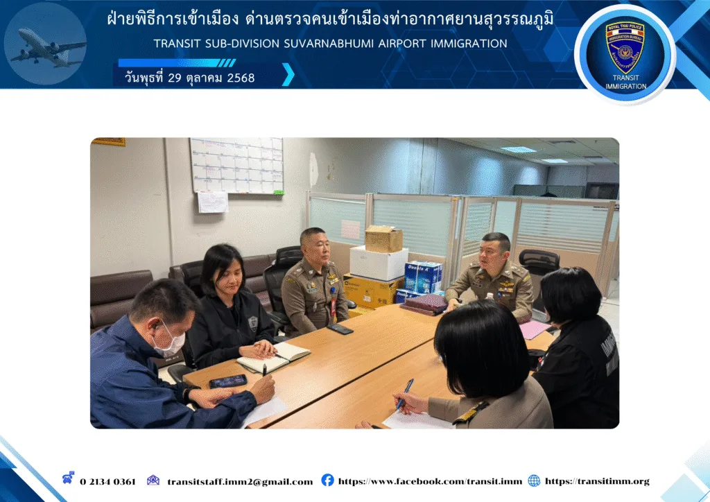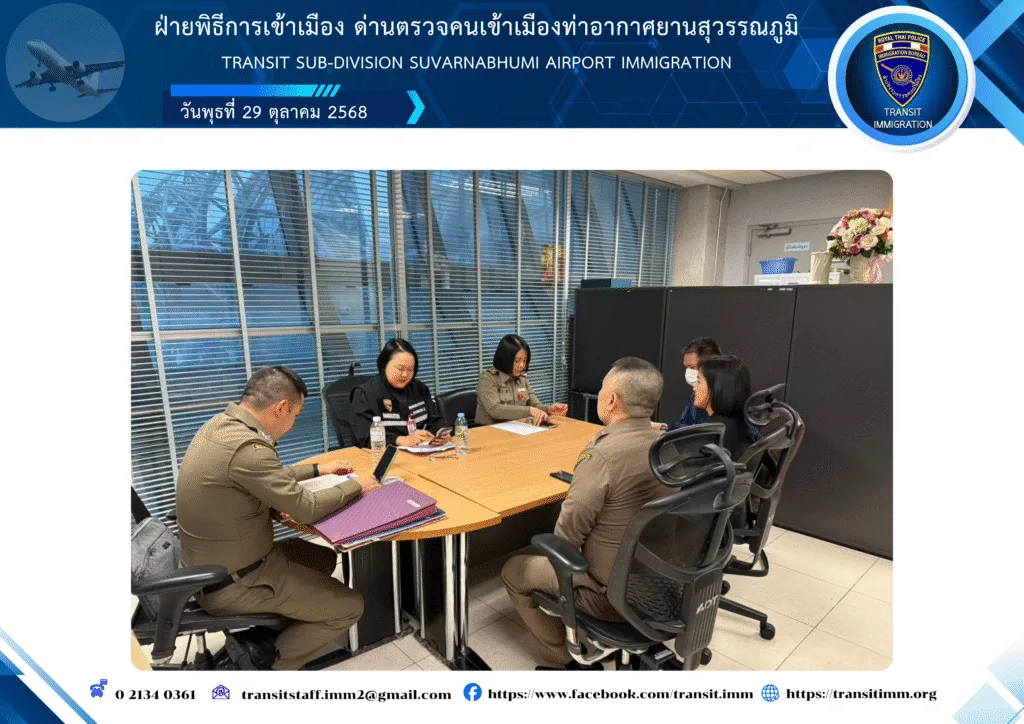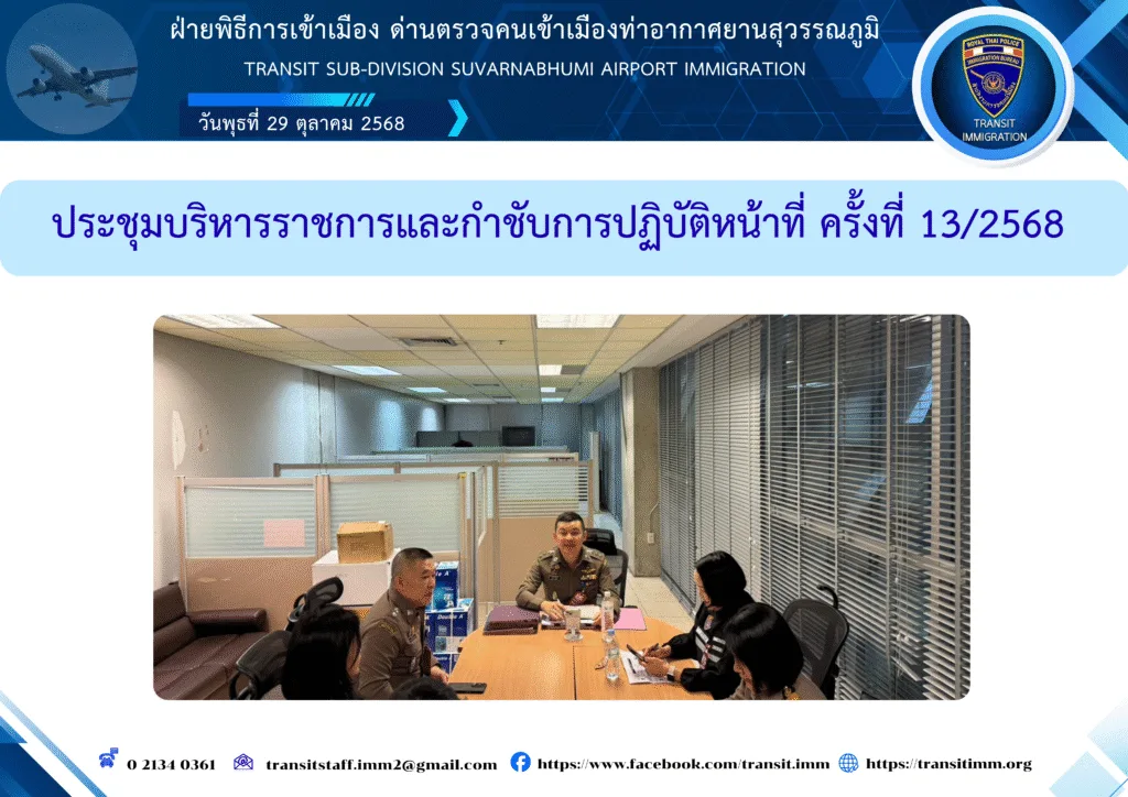 วันพุธที่ 29 ตุลาคม 2568 เวลา 14.00 น. พันตำรวจเอก กฤษณ์ ฉัตรทวี ผู้กำกับการฝ่ายพิธีการเข้าเมือง ด่านตรวจคนเข้าเมือง ท่าอากาศยานสุวรรณภูมิ พร้อมด้วยข้าราชการตำรวจในสังกัด ประชุมบริหารราชการฝ่ายพิธีการเข้าเมือง ด่านตรวจคนเข้าเมือง ท่าอากาศยานสุวรรณภูมิ ครั้งที่ 13/2568 เพื่อแจ้งข้อราชการที่สำคัญ, กำชับการปฏิบัติหน้าที่ตามนโยบายและข้อสั่งการของ ผู้บังคับบัญชาระดับ สำนักงานตำรวจแห่งชาติ, สำนักงานตรวจคนเข้าเมือง และกองบังคับการตรวจคนเข้าเมือง 2 พร้อมทั้งสอบถามปัญหาข้อขัดข้องการปฏิบัติหน้าที่ เพื่อให้การปฏิบัติงานเป็นไปด้วยความเรียบร้อย มีประสิทธิภาพ พร้อมทั้งขอบคุณและให้กำลังใจข้าราชการตำรวจทุกนายในการปฏิบัติหน้าที่ ณ ห้องประชุม ฝ่ายพิธีการเข้าเมือง ฯ ท่าอากาศยานสุวรรณภูมิ และประชุมผ่านระบบ Zoom Meeting