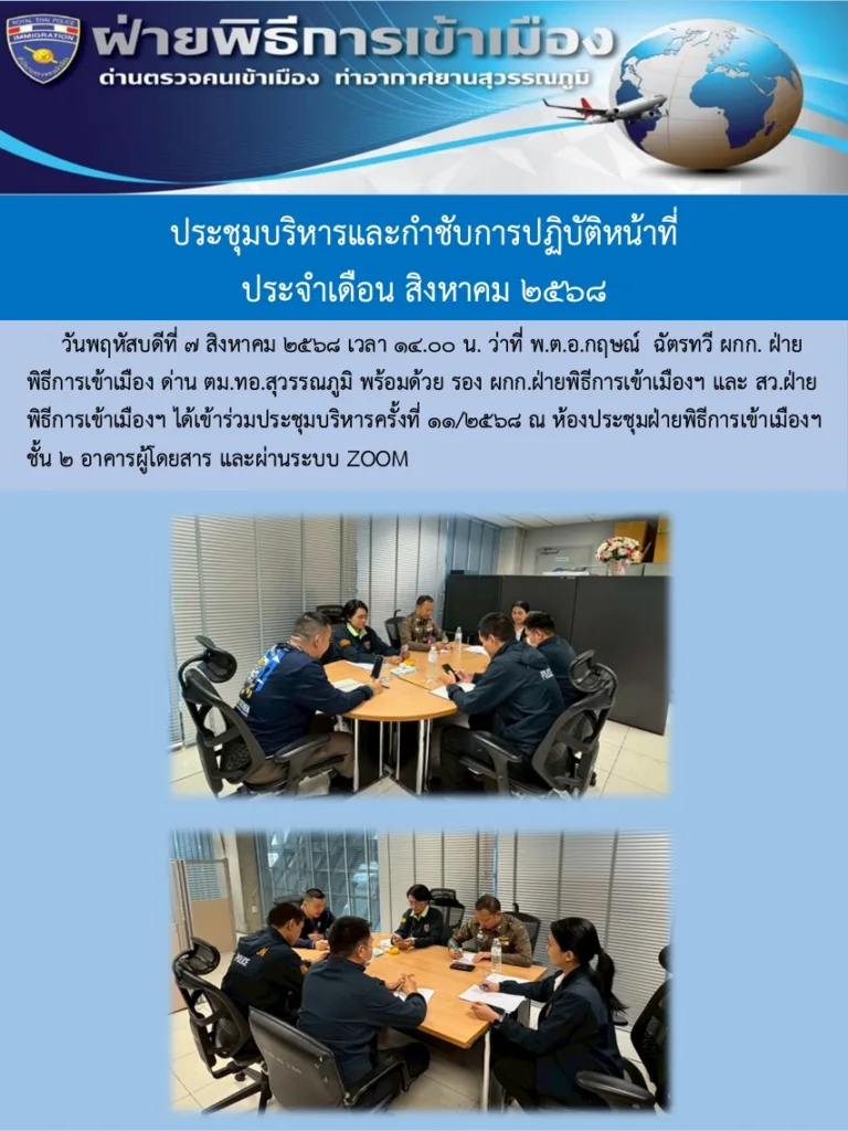 ฝ่ายพิธีการเข้าเมือง ด่าน ตม.ทอ.สุวรรณภูมิ : ประชุมบริหารและกำชับการปฏิบัติราชการ ครั้งที่ 11/2568