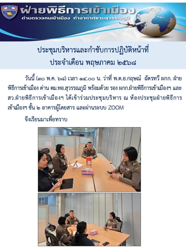 ฝ่ายพิธีการเข้าเมือง ด่าน ตม.ทอ.สุวรรณภูมิ : ประชุมบริหารและกำชับการปฏิบัติราชการ ครั้งที่ 8/2568