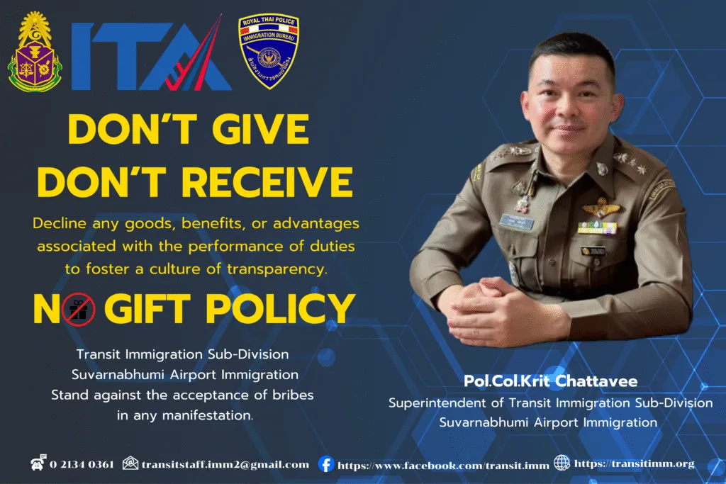 ฝ่ายพิธีการเข้าเมือง ด่าน ตม.ทอ.สุวรรณภูมิ ร่วมต่อต้านการรับสินบนในทุกรูปแบบ NO GIFT POLICY งดรับสิ่งของ หรือ สิทธิประโยชน์ จากการปฏิบัติหน้าที่หรือประโยชน์อื่นใด เพื่อสร้างวัฒนธรรมการทำงาน อย่างโปร่งใส