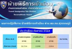 ฝ่ายพิธีการเข้าเมือง ด่านตรวจคนเข้าเมืองท่าอากาศยานสุวรรณภูมิ มิได้มีบริการ E-SERVICE แต่อย่างใด ข้อมูลในส่วนนี้จัดทำเพื่อความสะดวกของประชาชนในการติดต่อประสานงานกับหน่วยอื่น ๆ ที่เกี่ยวข้องเท่านั้น กรุณาตรวจสอบข้อมูลของท่านกับหน่วยงานที่ท่านจะไปดำเนินการต่าง ๆ อีกครั้งเพื่อความถูกต้อง